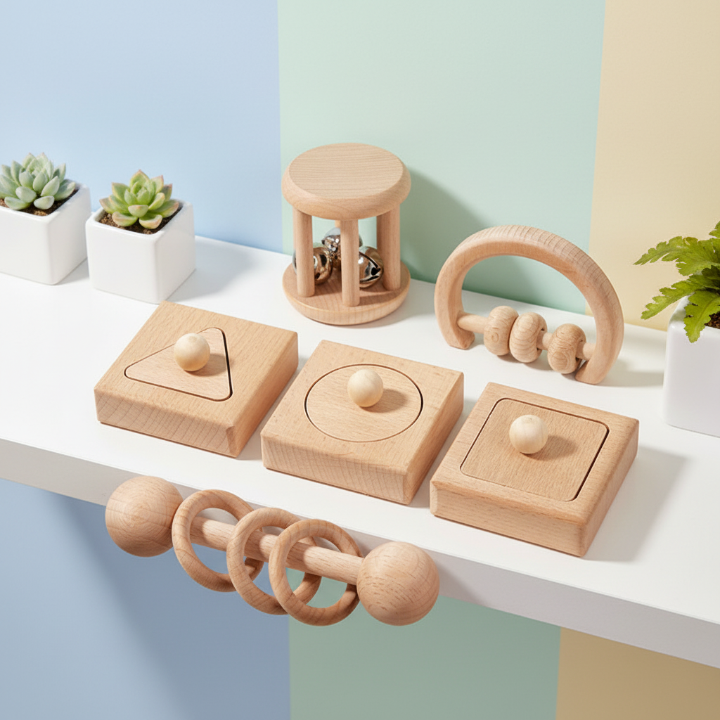 手工制作 6 件套婴儿摇铃 柔软山毛榉木玩具套装 早教木制婴儿摇铃 适合新生儿儿童