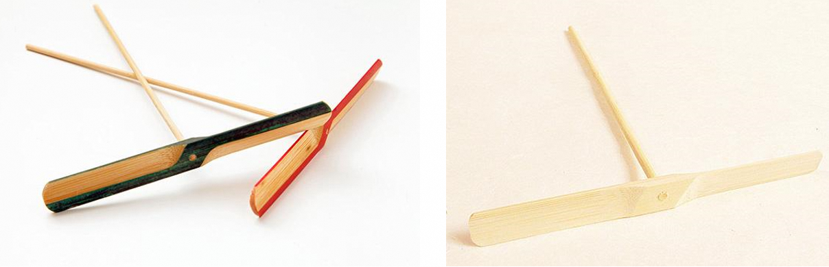 竹蜻蜓的结构是在一薄的长竹片两端对称各削一斜面,竹片中央置一圆孔,圆孔内安装一竹柄或木柄。玩时,用双手夹住竹柄,双手一搓然后放手,竹蜻蜓便会飞上天空。