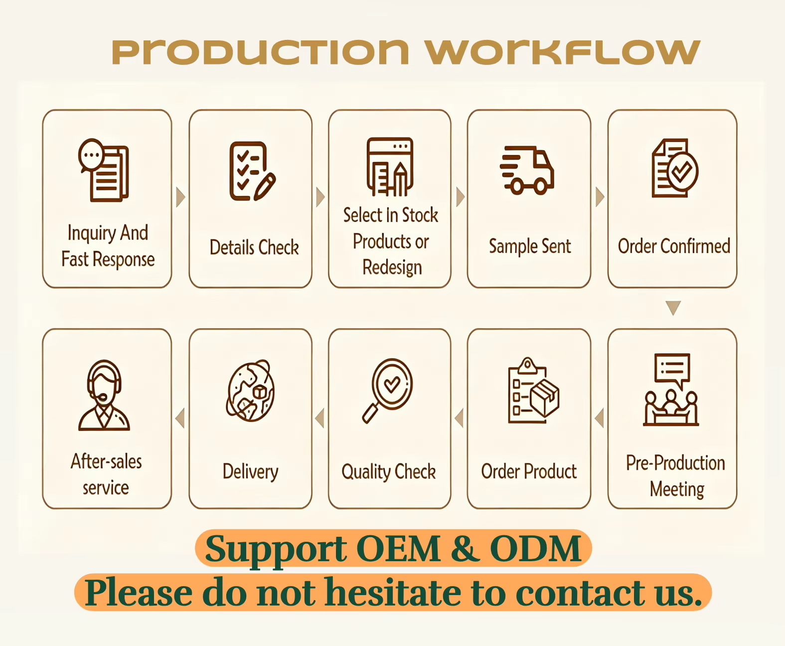 在批量生产之前,始终提供预生产样品;装运前始终进行最终检查;