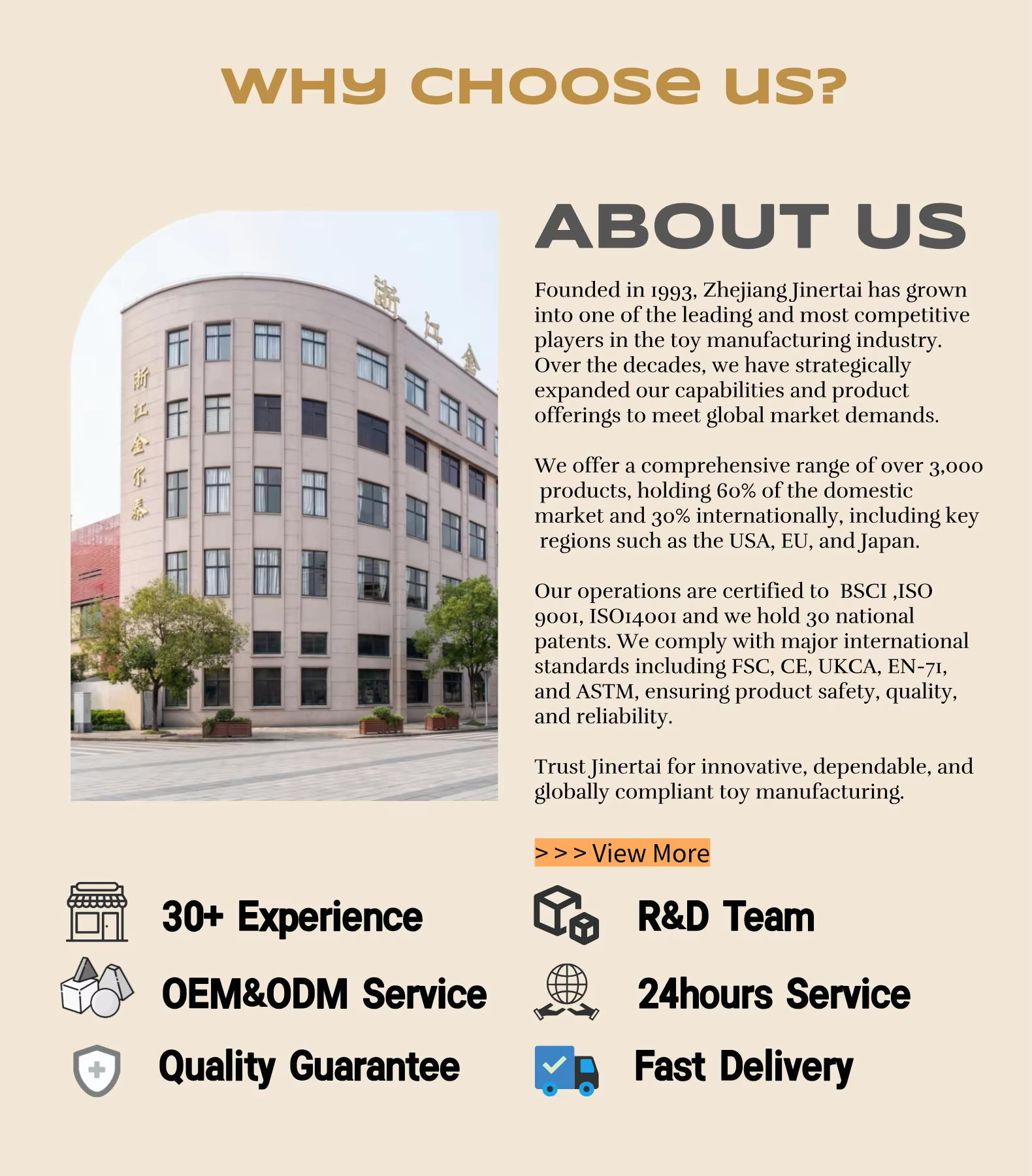 浙江金尔泰成立于1993年。我们通过了ISO 9001、FSC、GSV、BSCI认证,拥有30项国家专利,并符合相关行业的大多数国际标准,如C-TPAT、EN-71、ASTM等。