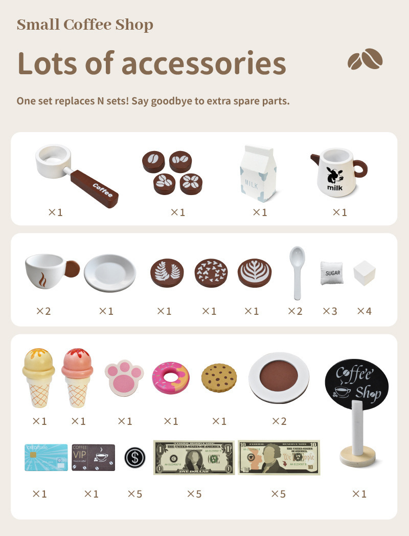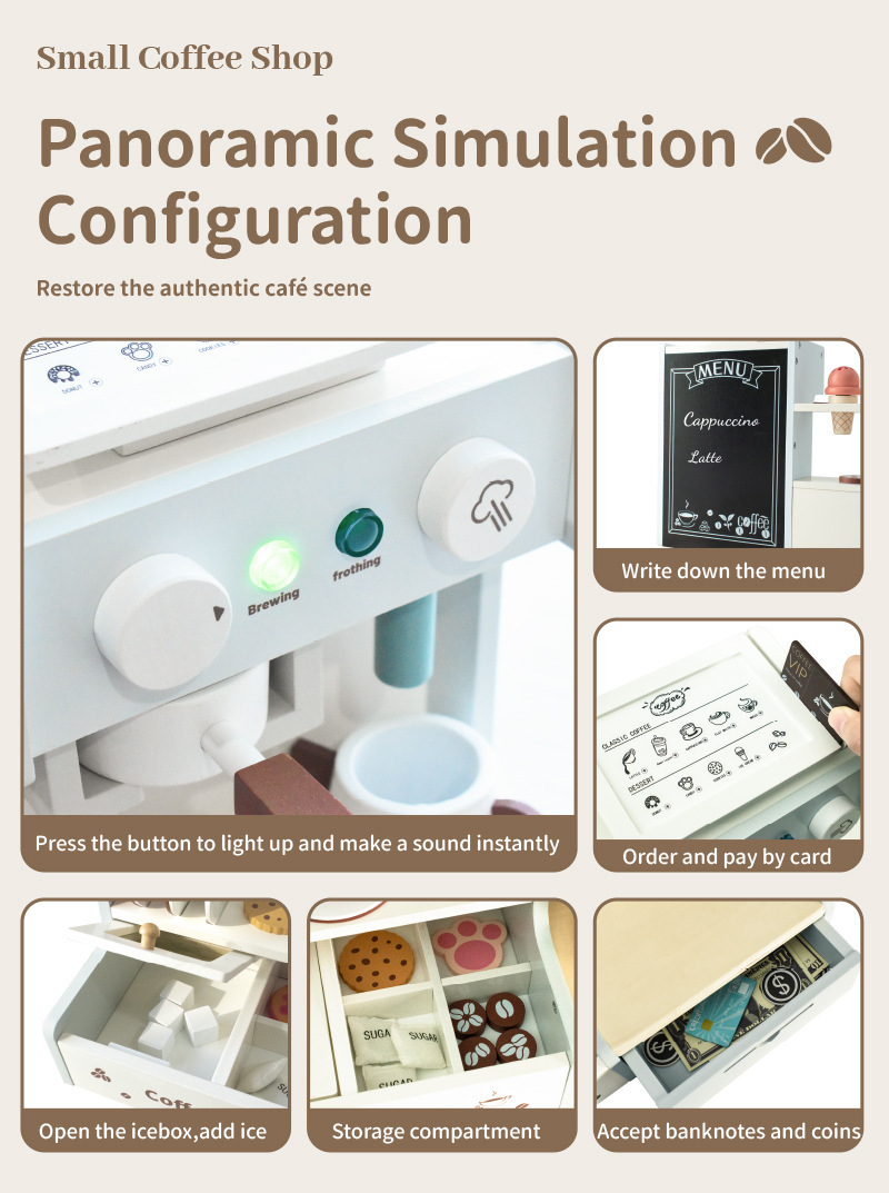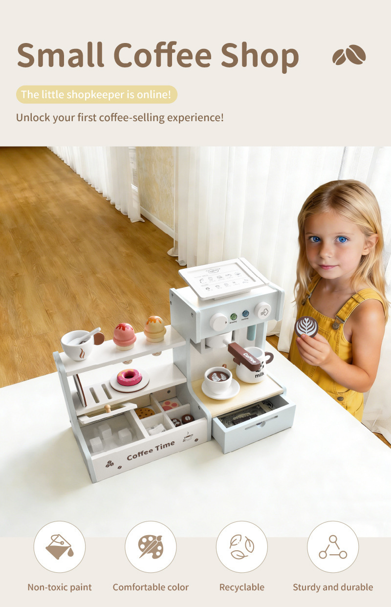 • 3-7岁儿童咖啡店玩具套装,带收银机,安全木制过家家玩具