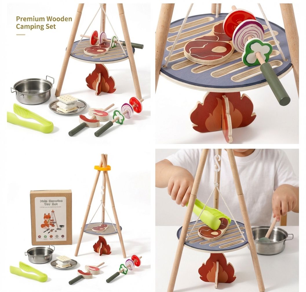 - 高级木质露营与烧烤假装游戏套装——儿童户外烹饪角色扮演玩具