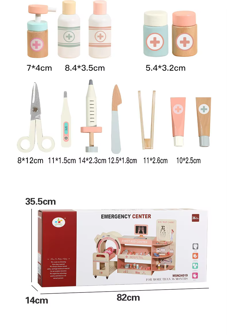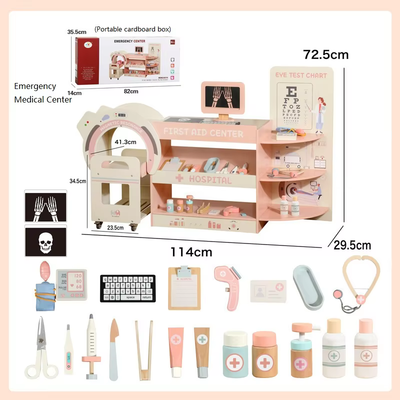 • 带核磁共振扫描仪的木制儿童医院玩具套装 - 幼儿医疗角色扮演玩具