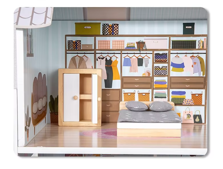 - 精美场景 + 全套家具:三层多室设计(卧室/客厅/厨房等) 配有全套实木家具和装饰品(壁炉、电脑、厨具、植物等) ),开箱即用,重现逼真的家庭环境,进行沉浸式角色扮演。