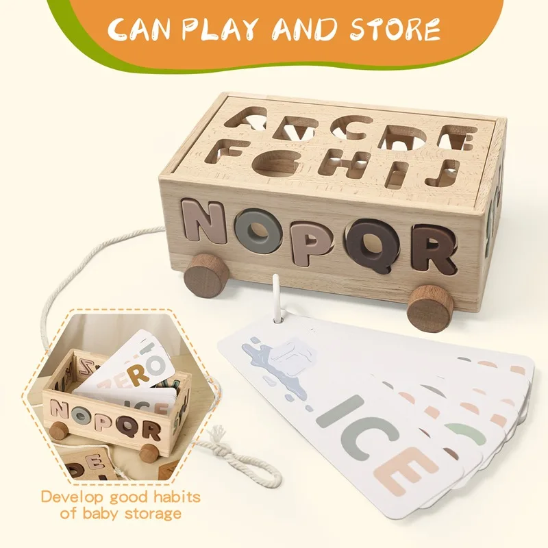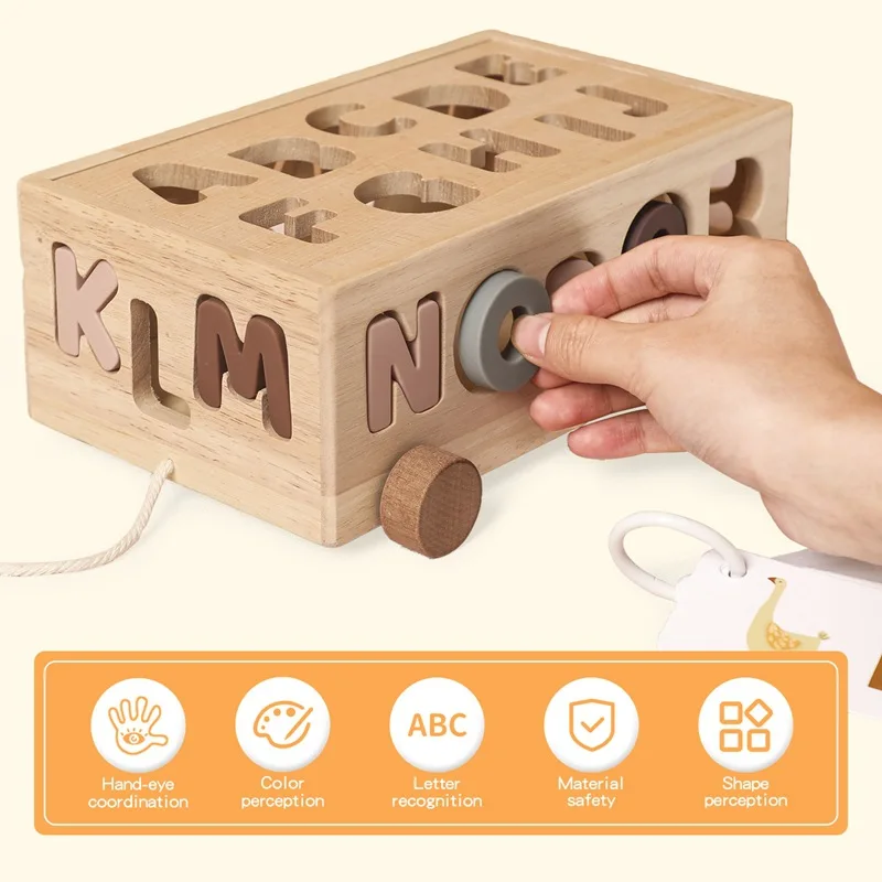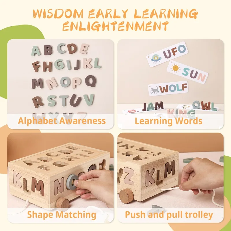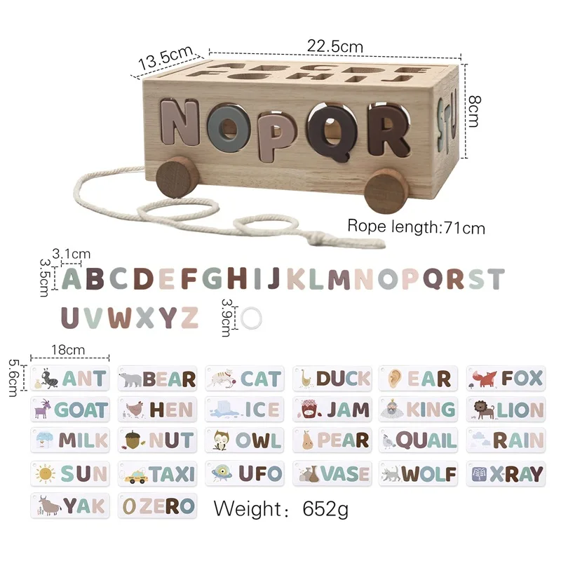 儿童手拉绳玩具车拖拉式益智木制玩具车婴儿友好型字母识别形状